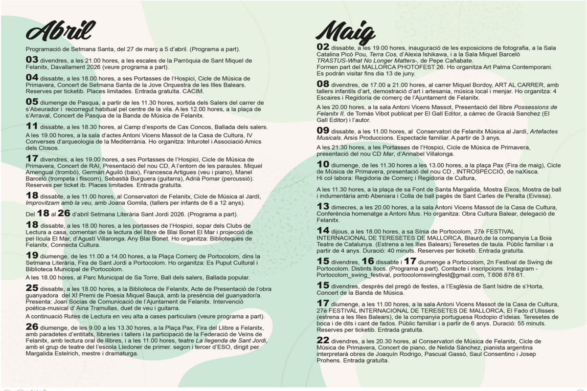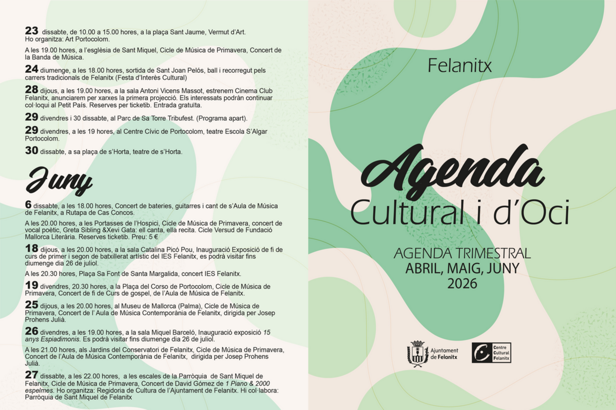 Agenda cultural i d'oci a Felanitx. Trobau al cartell els diferents actes dels mesos d'Abril, Maig i Juny.